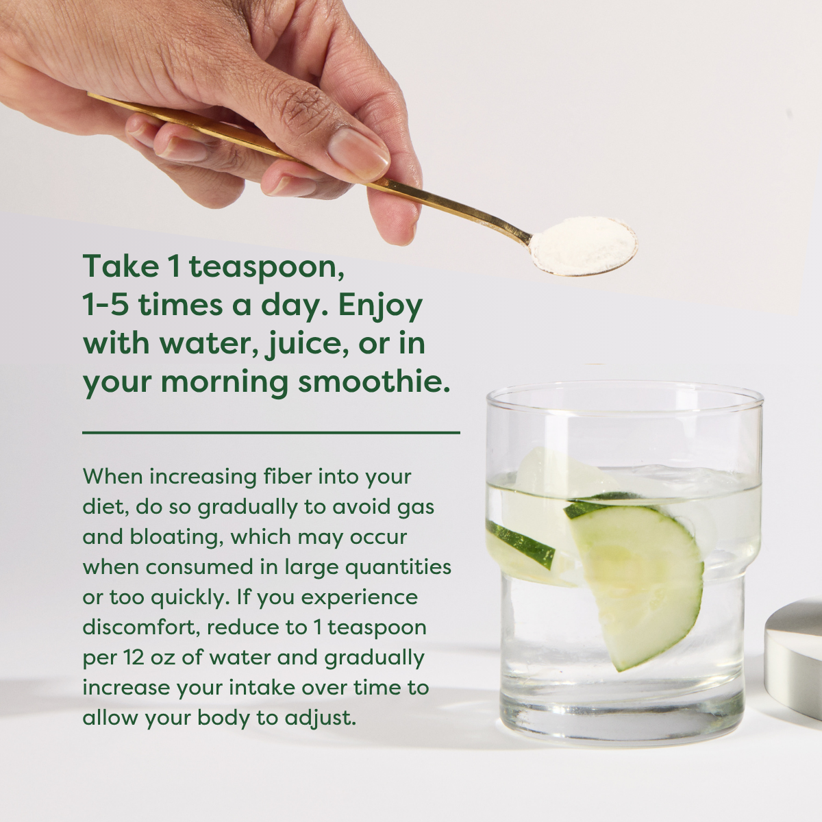 - When increasing fiber into your diet, do so gradually to avoid gas and bloating, which may occur when consumed in large quantities or too quickly. If you experience discomfort, reduce to 1 teaspoon per 12 oz of water and gradually increase your intake over time to allow your body to adjust.