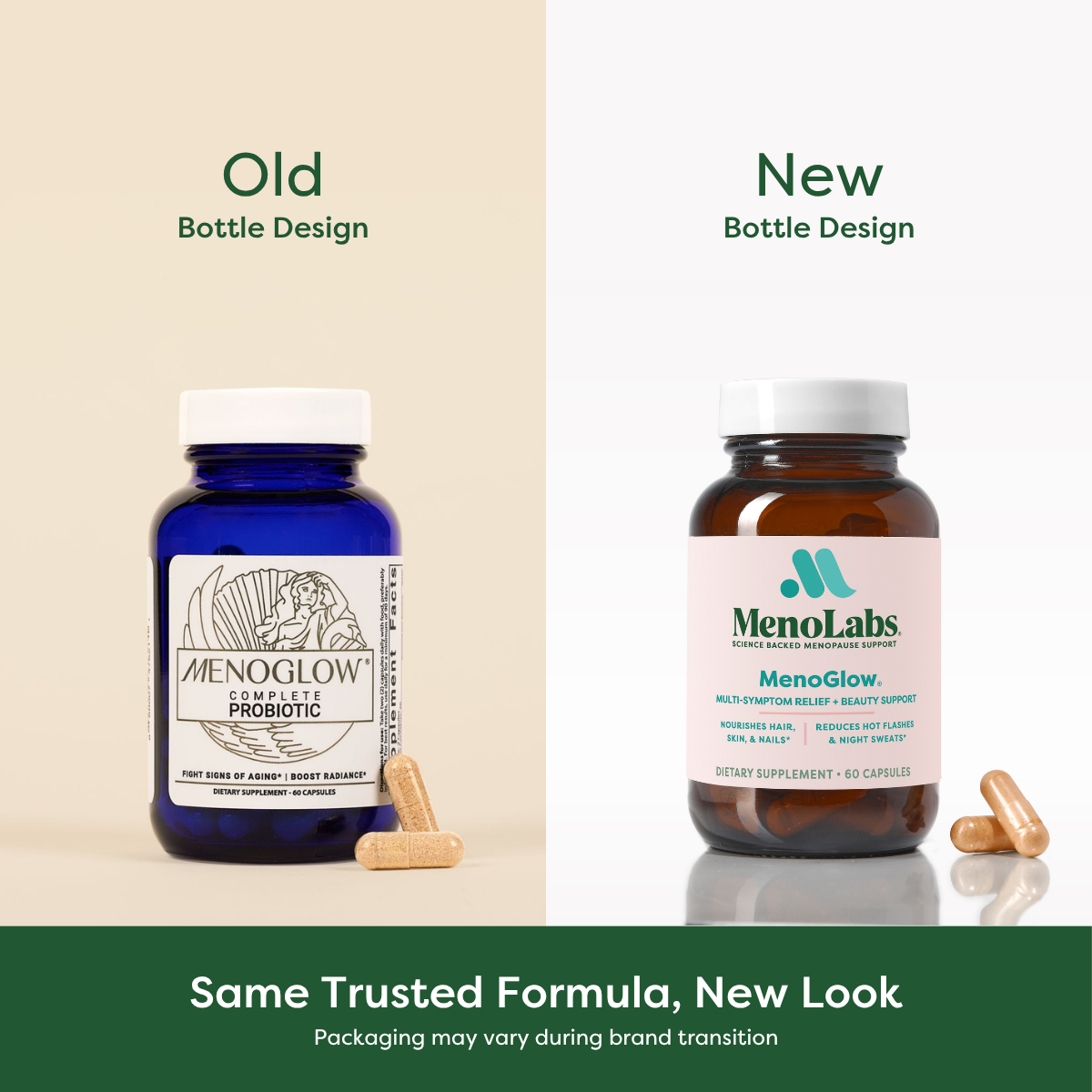While both products target menopause symptom relief like hot flashes and night sweats, MenoFit® supports metabolism, while MenoGlow® supports hair, skin, and nail health.*