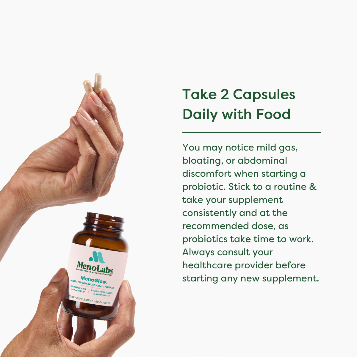 MenoGlow® provides relief from hot flashes and night sweats, while also supporting skin elasticity, hair and nail strength, and promotes collagen production during menopause.*