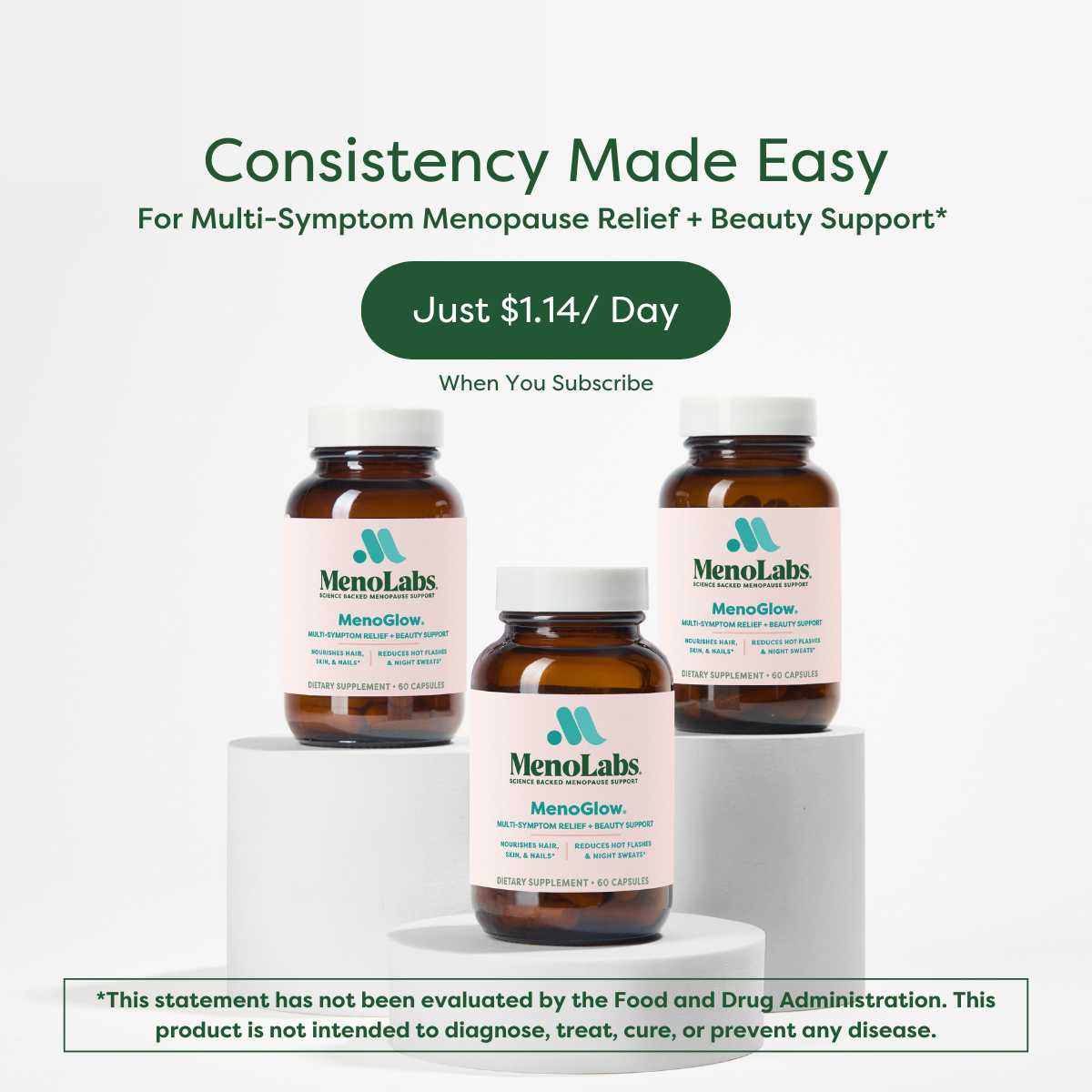 Get 90 days of “glow” and save!* MenoGlow® fights menopause symptoms like hot flashes and night sweats, plus includes a beauty-boosting blend of Vitamin C to support collagen production, Hyaluronic Acid to help improve skin elasticity, and antioxidant-rich Zinc and Vitamin E to nourish your skin, hair, and nails from the inside out.*