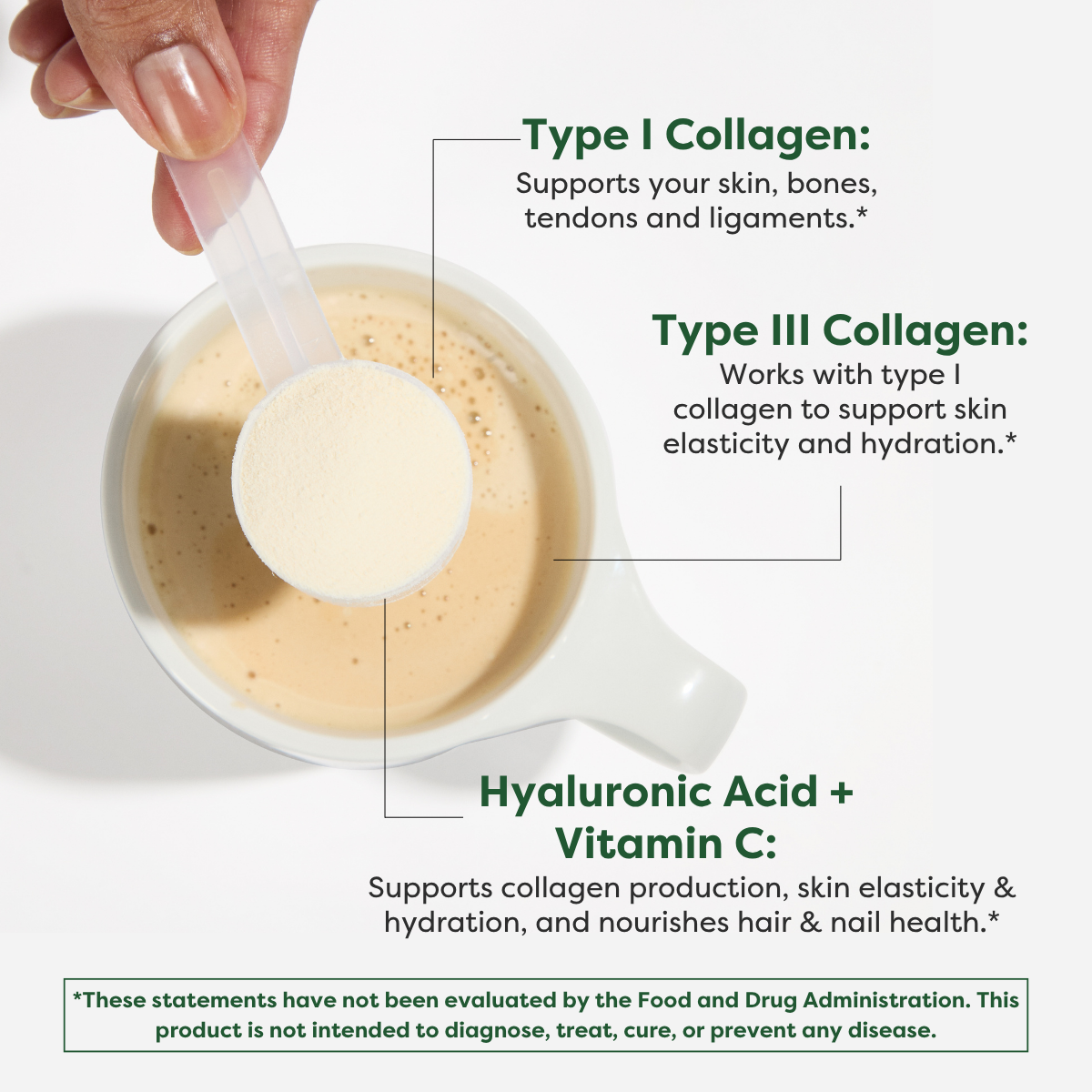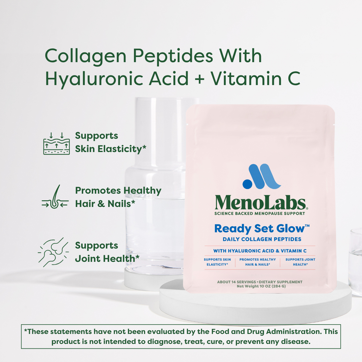 Experience healthy radiance.* Ready Set Glow contains both Type I and III bovine collagen peptides, plus hyaluronic acid and vitamin C to nourish hair, skin, and nails, and provide support for bones, tendons, and ligaments.* Unflavored and no artificial flavors, colors, or added sugar.